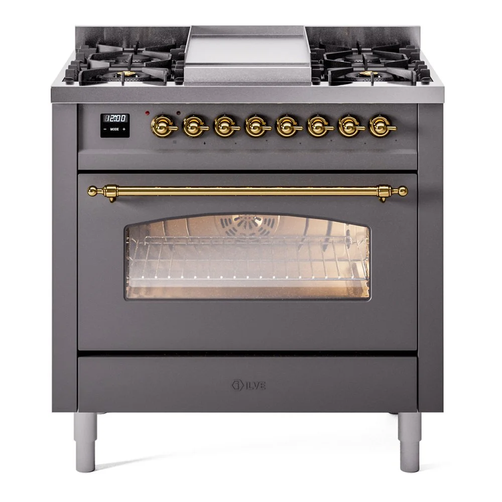ILVE UP36FNMPMGG Nostalgie II 36 inch Dual Fuel Range (Natural Gas, Triple Glass Door, Graphite Matte, Brass)