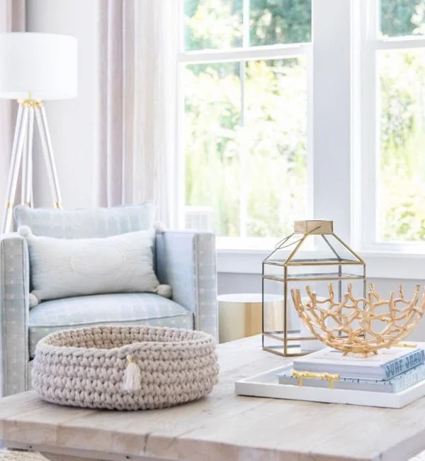 The chic Rothko Swivel Chair by Robin Bruce is a true style chameleon, with its ability to sway more toward a traditional or super contemporary aesthetic depending on design choices. Designer Emily McAden chose an ice blue cotton-linen blend with a subtle checked pattern for this sitting space, giving it a traditional look that is lightened and brightened by the fresh, coastal-feeling palette. High-end finishes like gold, glass and lucite add a touch of sparkle!